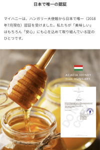 日本で初めてハンガリー大使館から証明書を取得したマイハニーの100%ハンガリー産「アカシア生蜂蜜」を使用しております。